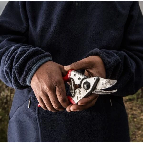 Felco 6 is het kleine broertje van de klassieke Felco 2! Het is een ergonomische professionele snoeischaar met comfortabele, lichte en stevige handgrepen van gesmeed aluminium. Zowel het bovenmes als het geschroefd ondermes van de spits toelopende snoeibek zijn gemaakt in hoogwaardig gehard staal. Alle onderdelen van deze schaar kunnen worden vervangen.